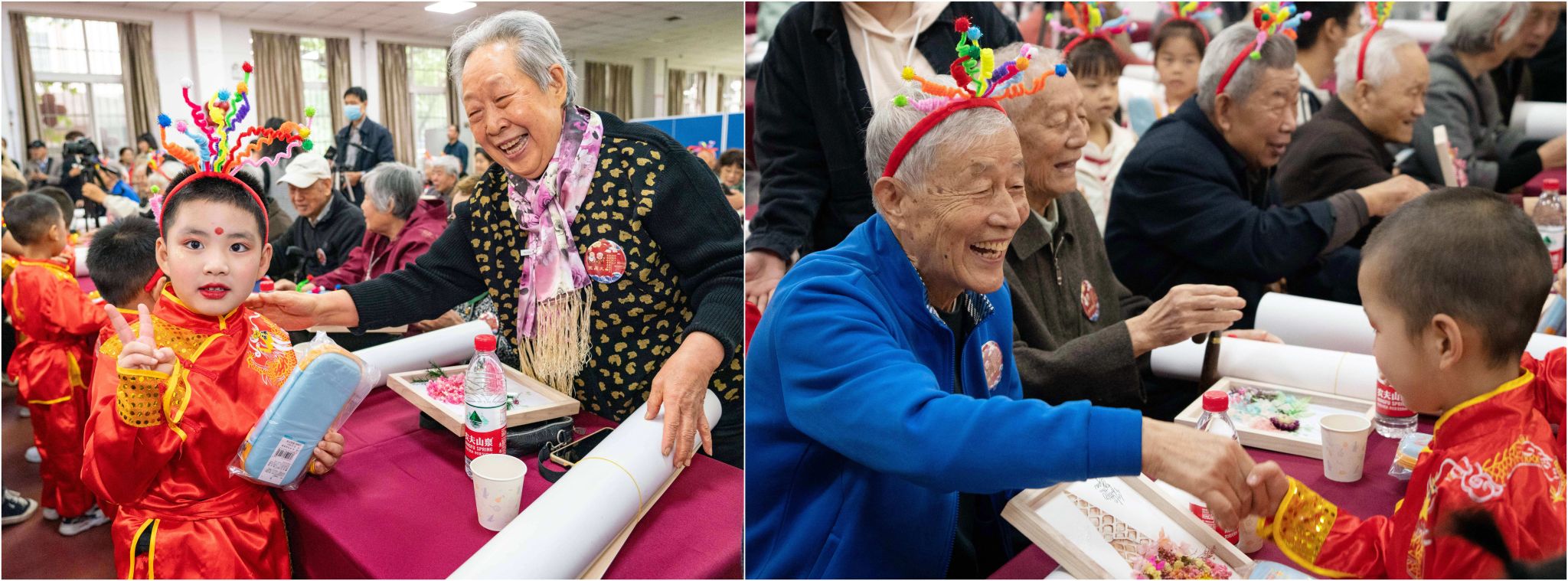 与会嘉宾向寿星代表赠送追梦书画协会会员所写的“寿”字并送上诚挚祝福;幼儿园小朋友与老寿星代表互赠礼物,传递浓浓的老少情义;幼儿园小朋友带来舞蹈《祝福》、《中国少年郎》,充满活力和乐趣,现场不断响起阵阵掌声。