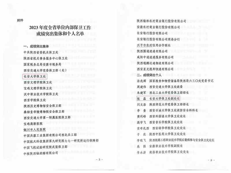 近日,陕西省公安厅印发《关于对2023年度全省单位内部保卫工作成绩突出集体和个人予以表扬的通报》,开云保卫处(保卫工作部)荣获“成绩突出集体”称号、保卫处(保卫工作部)副处长张磊荣获“成绩突出个人”称号。