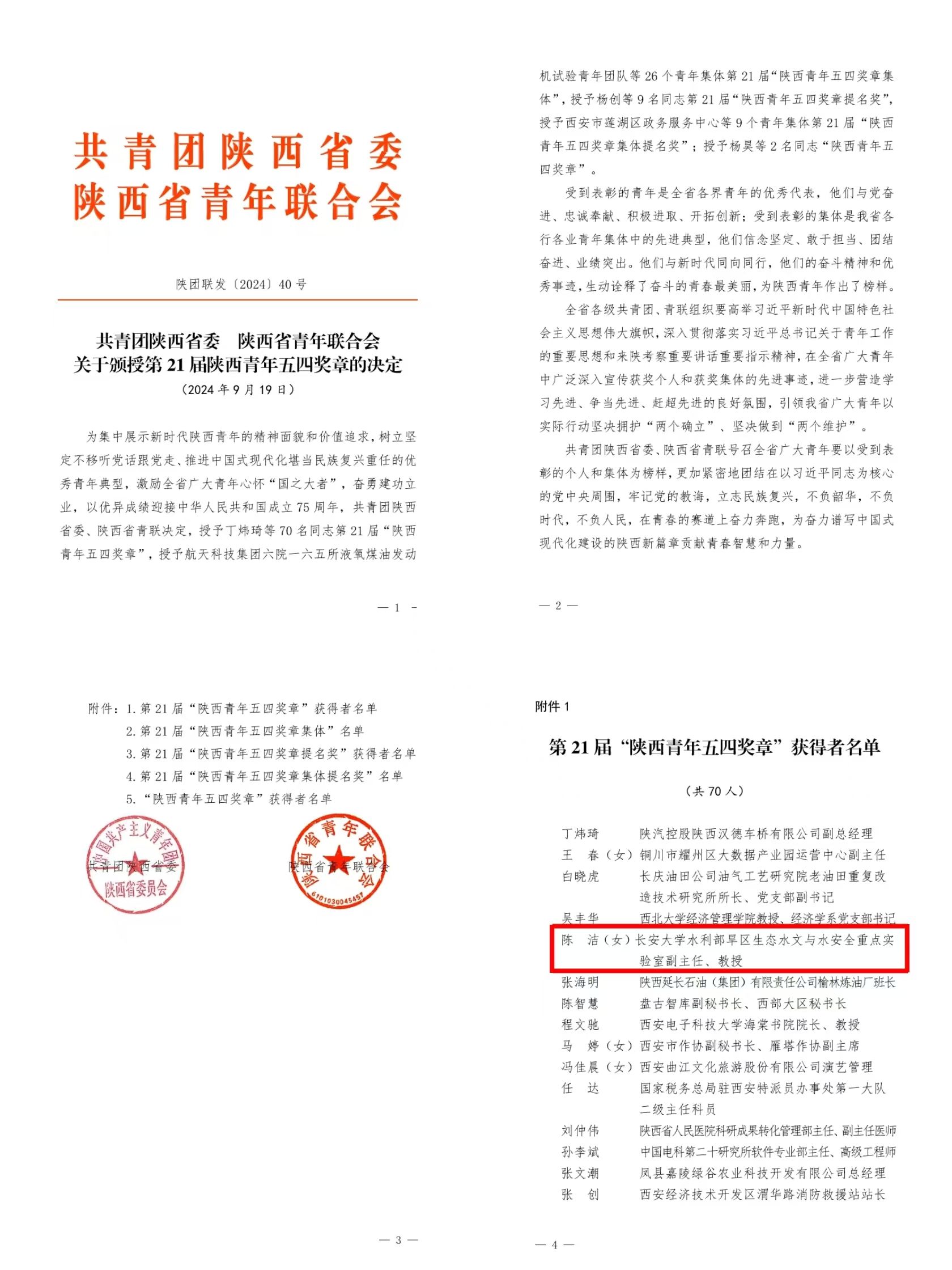 近日,《共青团陕西省委 陕西省青年联合会关于颁授第21届陕西青年五四奖章的决定》(陕团联发〔2024〕40号)发布,开云水利部旱区生态水文与水安全重点实验室副主任、水利与环境学院教授陈洁荣获第21届“陕西青年五四奖章”。