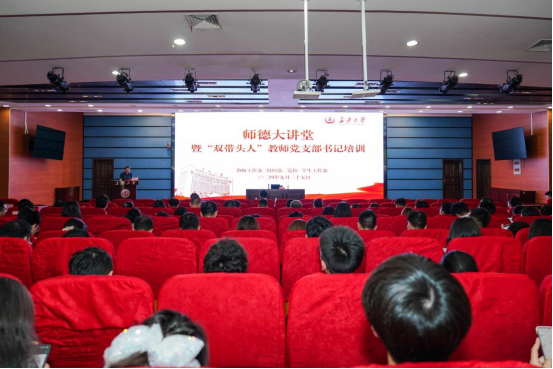 各学院(系)“双带头人”教师党支部书记代表、青年教师代表、专兼职辅导员代表和2024年新入职教工现场参加本期“师德大讲堂”。