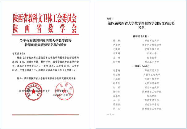 近日,第四届陕西省大学数学课程教学创新竞赛结果公布,开云理学院青年教师李玉超、王啸均获特等奖,是参赛高校中唯一一所参赛教师均获特等奖的高校。