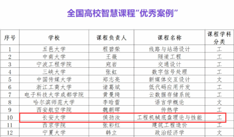 近日,第一批全国高校“智慧课程”案例评选活动公布获奖名单,工程机械学院教师侯劲汝主讲的《工程机械底盘理论与性能》课程荣获第一批全国高校智慧课程“优秀案例”。此次评选活动由混合式教学创新者联盟联合中南大学、吉林大学、西安电子科技大学、西南交通大学等高校共同发起,旨在推动高等教育教学模式的创新与改革。全国各地高校教师及教学团队共提交172份课程建设实践案例,经两轮严格的专家评审,共有27门课程获“最佳案例”,18门课程获“优秀案例”。