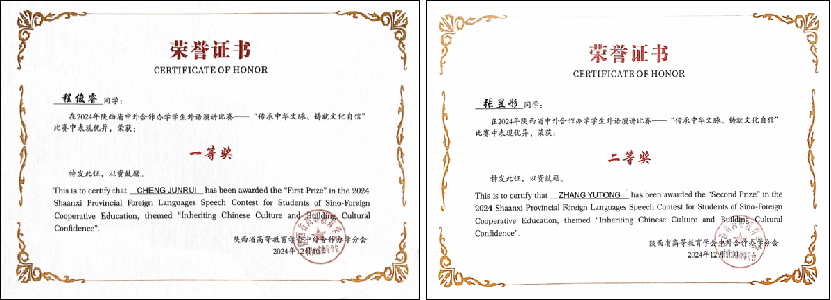 12月10日,2024年陕西省中外合作办学学生外语演讲比赛在西北大学举行,开云长安都柏林国际交通学院2022级本科生程俊睿和张昱彤分别获得一等奖和二等奖。
