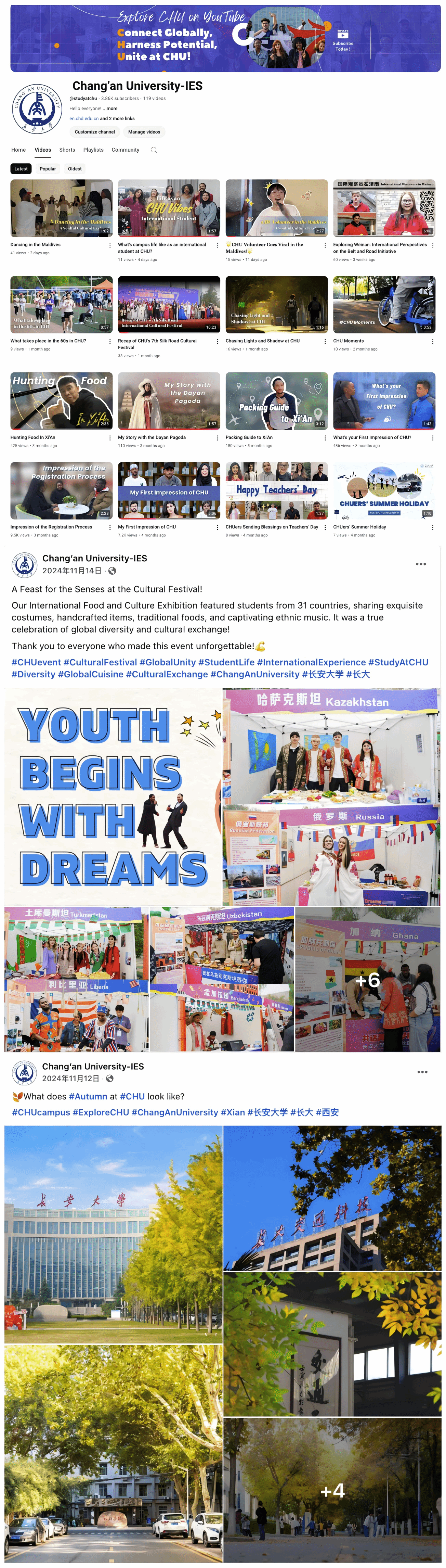 近年来,国际教育学院积极贯彻落实党的二十大关于加快建设教育强国、科技强国、人才强国和加强国际传播能力建设的战略部署,高度重视海外网络传播,着力擦亮“留学长大”名片,注册运营X(Twitter)、Facebook、Instagram、TikTok等社交媒体账号,2024年全年各平台共发布推文524篇,曝光量4,753,238次,链接点击量30,468次,平台总粉丝134,755人,新增粉丝46,768人。目前,学校海外社交媒体账号共推出“长大光影”“长大前沿”“西安生活”等栏目,在招生季、迎新季与毕业季策划专题内容,生动全面介绍校园生活、展示学校发展成就,服务来华留学生招收管理。“Youth Begins with Dreams第七届丝路文化节”“留学十二时辰”等贴文获得广泛关注,反响良好。