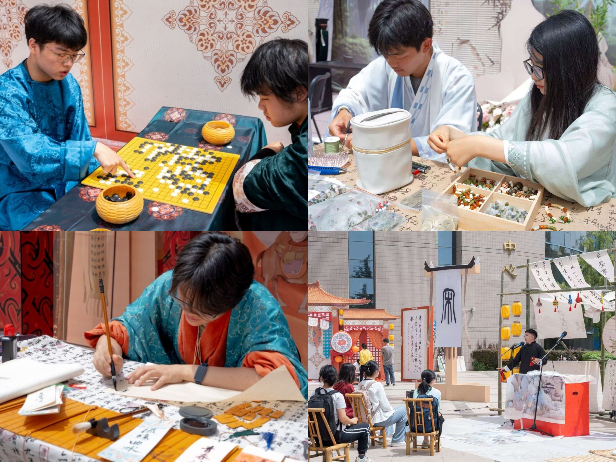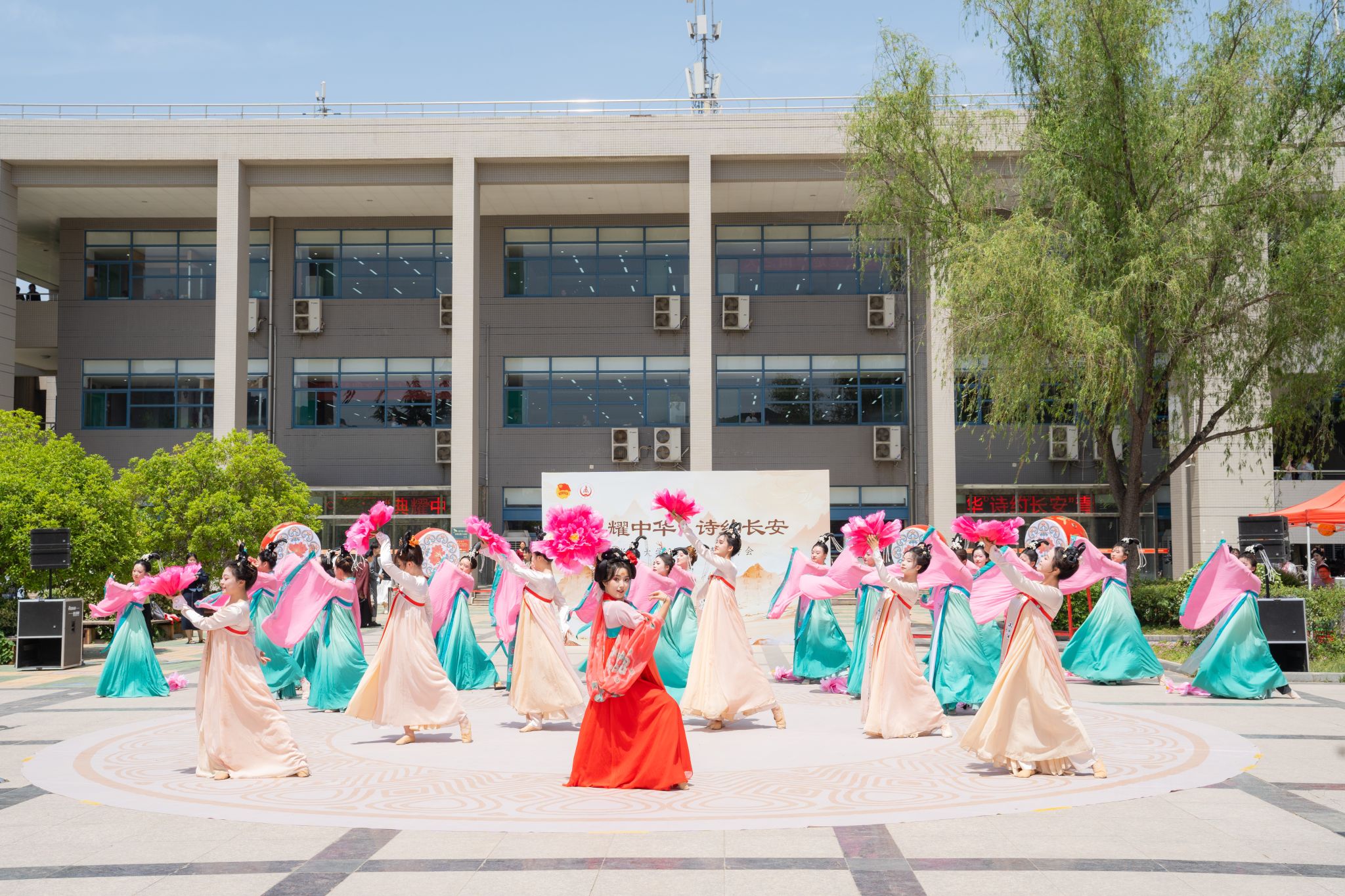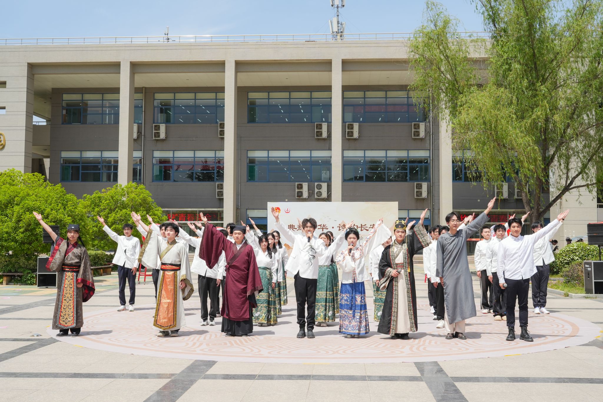 本次系列活动共分为“典耀中华·诗约长安”青春诗会和“艺韵长安”中华古诗词经典传唱音乐会两个部分。4月23日中午,“典耀中华·诗约长安”青春诗会在北校区树蕙园广场举行。活动在庄重典雅的《八佾舞·礼迎八方宾朋》中拉开序幕,先秦诗韵《先秦绮梦·雅颂流芳》与经典吟诵《家国书韵》展现了经典诗词和传统礼仪文化的深厚底蕴,古风合唱《秦风·无衣》以雄浑歌声展现秦风豪迈,汉唐乐舞《蹴鞠图》、宋时民乐《青玉案·元夕》及华服走秀《千年霓裳·朝代华章》等节目以歌、乐、舞等多元形式演绎传统文化精粹,尾声《致吾辈》以激昂旋律彰显青年学子传承创新的使命担当。诗会现场搭建“西周礼乐、先秦诗赋、汉风雄章、魏晋风骨、大唐气象、宋元清韵”等六个主题场景,设置书法、品茗、对弈、射箭、拓印、蹴鞠及古琴演奏等互动项目。师生们通过体验青铜礼乐、编钟演奏、茶道雅集等活动,沉浸式感知西安古都的历史脉络,感受中华优秀传统文化的独特魅力。