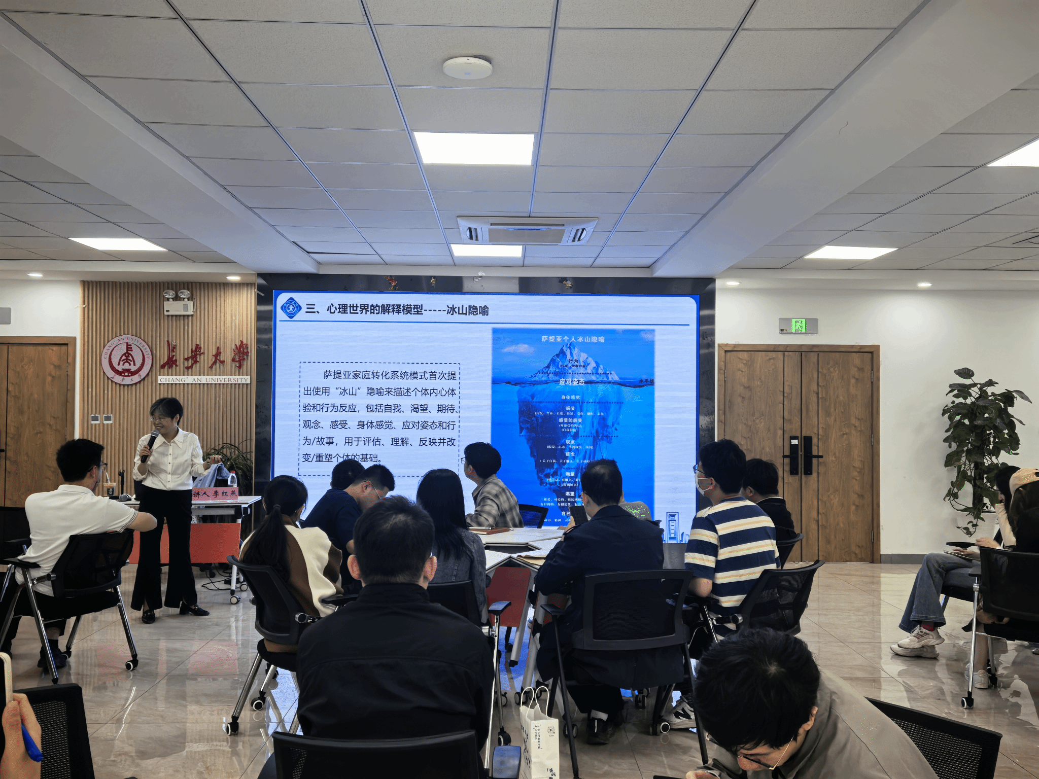 李红燕结合丰富的心理学教学及心理咨询经验,从理论阐释、案例解析、方法指导三个维度展开培训。她首先系统讲解了萨提亚家庭系统转化模式的核心原理,通过冰山理论可视化模型,深入剖析学生行为表征下的心理诉求、情感体验和原生家庭影响。随后,李红燕采用体验式教学方法,生动演示了如何运用“冰山解析”技术洞察学生心理状态,指导辅导员更直观地理解学生的内心体验和行为模式。针对新时代大学生心理特点,李红燕建议辅导员在日常工作中积极拓展学生实践与社交机会,强化协同育人机制,完善家校医社各方支持系统,不断提升学生心理危机的应对处置能力。