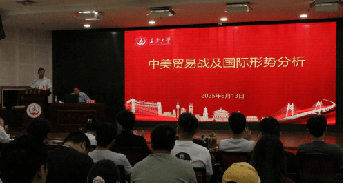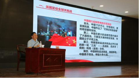 许森教授从历史背景、发展局势、矛盾动因等多个维度,对中美经贸博弈与区域安全形势进行了全面深入剖析。他指出,在经济领域,美国发动关税战,意图重塑全球贸易体系,但中国凭借完整产业链和开放战略已具备反制能力;在科技领域,美国加紧封锁,而中国青年科研力量崛起,大国重器频出,正在突破技术壁垒;面对美国在台海、南海等地的军事围堵,中国以综合国力为支撑,展现出坚定战略定力。讲座深化了参会师生对中美贸易战及当前国际局势的认识理解,有效激发了全体师生的爱国情怀与担当意识。