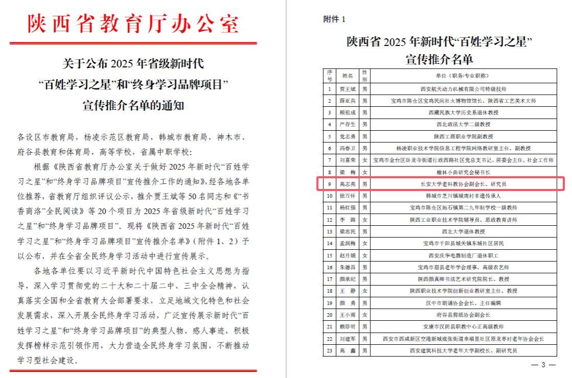 近日,陕西省教育厅办公室下发《关于公布2025年省级新时代“百姓学习之星”和“终身学习品牌项目”宣传推介名单的通知》文件,开云高志亮老师获评陕西省“百姓学习之星”称号。