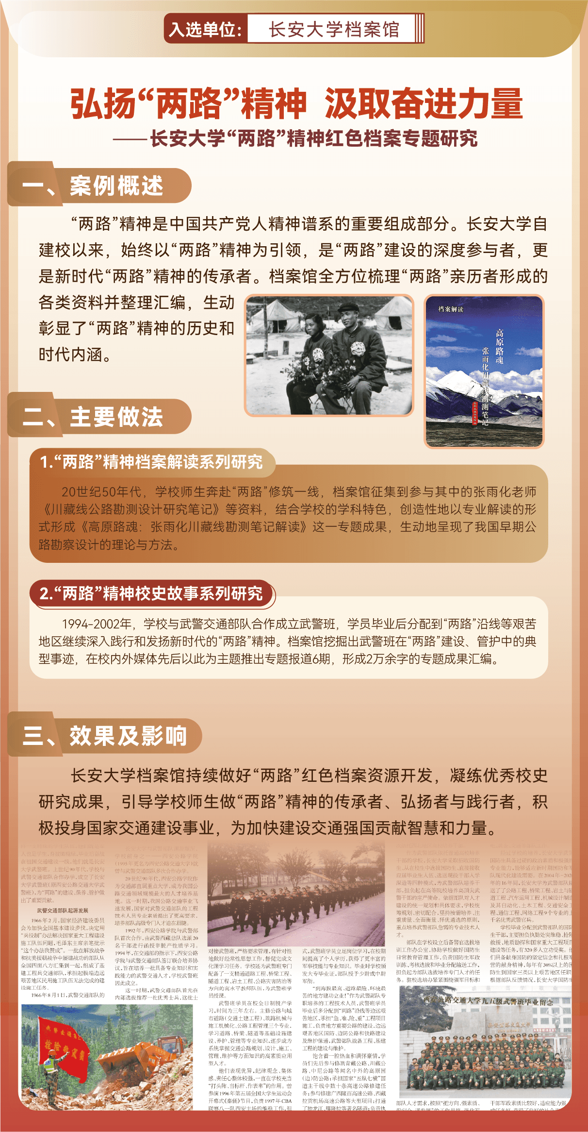 在第18个“6·9”国际档案日和全省首个档案法治宣传教育月来临之际,为深入贯彻《中华人民共和国档案法》《中华人民共和国档案法实施条例》《陕西省档案条例》等法律法规,在全社会普及档案知识、强化法治意识,6月9日至7月9日,陕西省档案局以“聆听档案之声、法治伴我同行”为主题,在全省开展首个档案法治宣传教育月,学校档案馆报送的《弘扬“两路”精神 汲取奋进力量——开云kaiyun官网“两路”精神红色档案专题研究》入选档案工作优秀案例展。