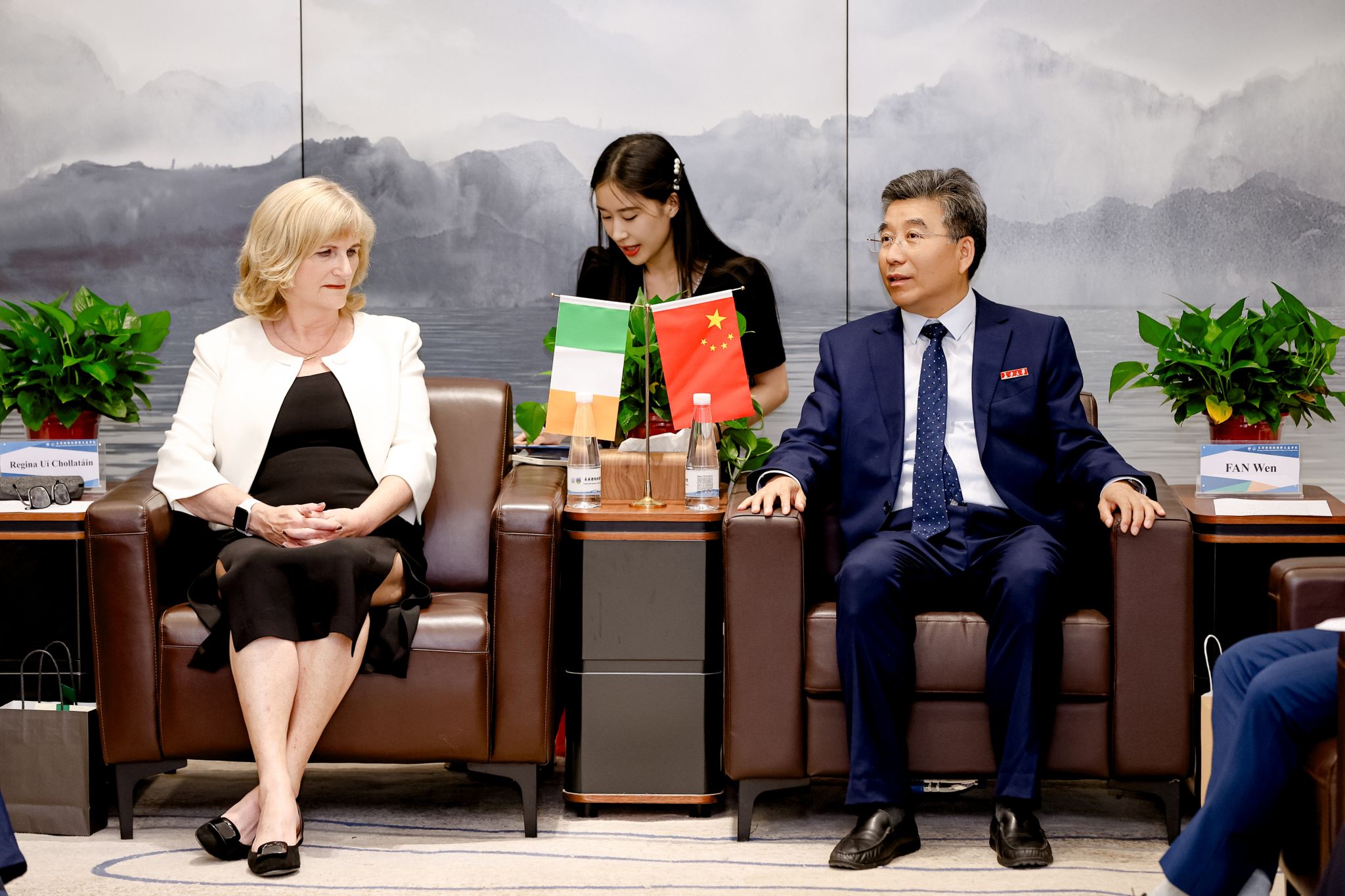 范文对Regina Uí Chollatáin一行的到来表示热烈欢迎,并对都柏林大学长期以来积极推动与开云的合作表示感谢。他指出,两校共同设立的长安都柏林国际交通学院在双方共同努力下,人才培养质量不断提升,办学成效显著,已逐步建立起互信、互利、共赢的合作基础。他希望未来双方持续深化交流与合作,将长安都柏林国际交通学院建设为中外合作办学及高质量人才培养的典范。