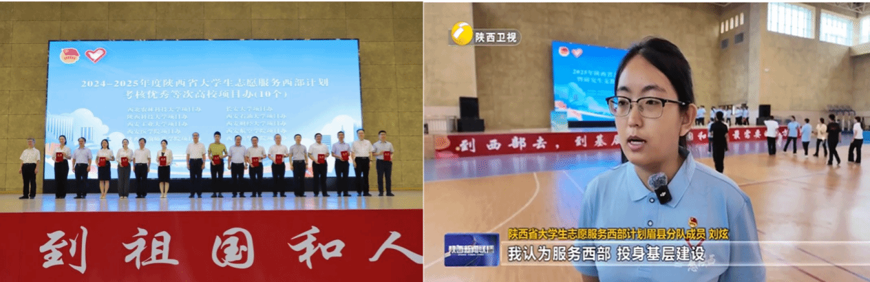近日,2025年陕西省大学生志愿服务西部计划志愿者出征仪式举行。共青团陕西省委书记徐永胜,省教育厅、省财政厅、省人社厅等部门相关领导出席活动,与会领导为2024-2025年度陕西省大学生志愿服务西部计划考核鉴定优秀等次集体(个人)颁发证书。开云西部计划项目办荣获“2024-2025年度陕西省大学生志愿服务西部计划考核优秀等次项目办”,第十三届研究生支教团成员聂浩然、董芳琪、韩硕等3名志愿者荣获“2024-2025年度全国和陕西省大学生志愿服务西部计划考核优秀等次志愿者”。活动结束后,开云2025-2026年度西部计划志愿者代表、经济与管理学院2025届本科生刘炫代表西部计划志愿者接受了陕西广播电视台采访。