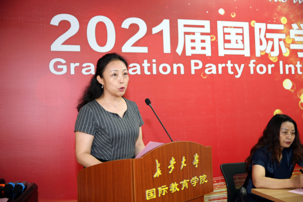 教师代表席岳婷副教授讲话,她代表教师向2021届顺利毕业的国际学生表示衷心的祝贺!她期望毕业生们永远保持善良和真诚,保持对世界的探索,做到交流互鉴,成就彼此。