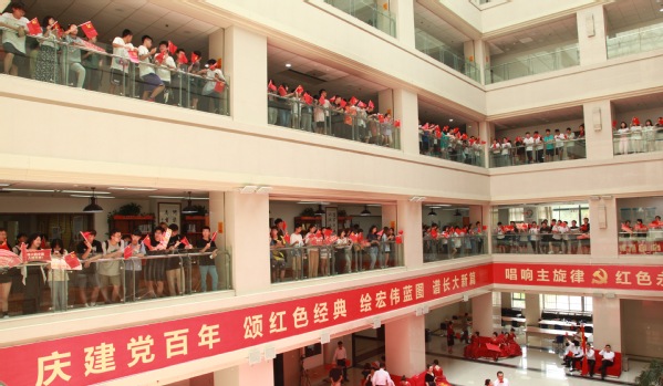 为庆祝中国共产党成立100周年,落实学校《关于在党史学习教育中开展“五个一百”工程的通知》精神,7月1日下午图书馆在北校区举办“庆建党百年,颂红色经典”主题活动。校党委副书记、副校长彪晓红,校党委常委、统战部部长王耀文,图书馆党政负责人和党员、民主党派、职工代表、近400名学生参加了本次活动。活动由馆长赵文义主持。