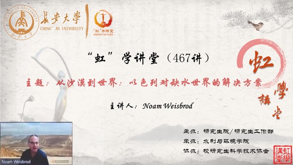 5月31日下午,由研究生院/研究生工作部主办、水利与环境学院承办、校研究生科学技术协会协办的“虹”学讲堂第467讲以线上线下相结合的形式顺利举办。扎克伯格水研究所环境水文学教授Noam Weisbrod作了题为“从沙漠到世界:以色列对缺水世界的解决方案”的报告,水利与环境学院罗平平教授主持,相关学院共180余名师生参加讲座。
