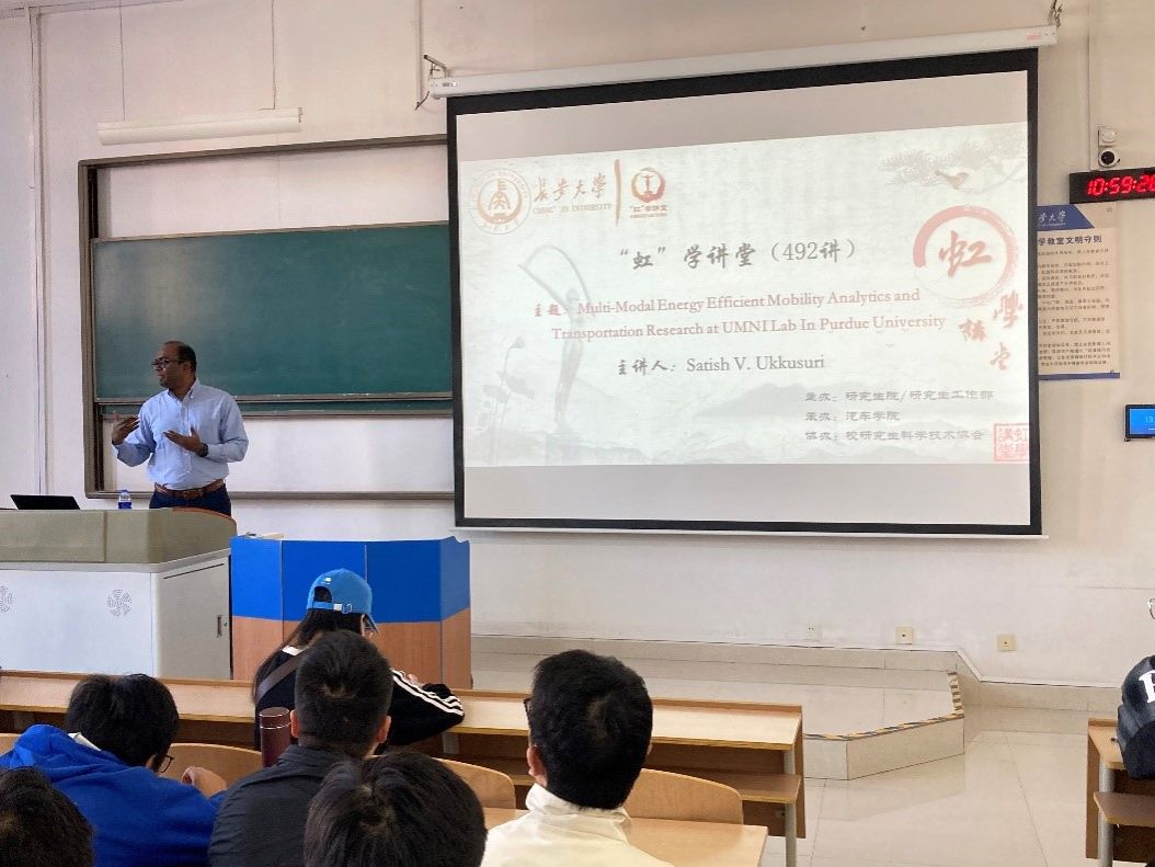 10月15日上午,由研究生院/研究生工作部主办、汽车学院承办、校研究生科学技术协会协办的“虹”学讲堂第492讲在北校区鸿远教学楼1101教室举办。美国普渡大学Ukkusuri教授作了题为“Multi-Modal Energy Efficient Mobility Analytics and Transportation Research at UMNI Lab In Purdue University”的报告,汽车学院副院长牛世峰教授主持报告会,相关学院共100余名师生参加讲座。