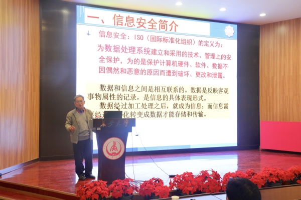 报告主要围绕信息安全和关键信息基础设施两部分展开。赵元哲教授从背景、信息安全概念、安全问题等多个方面对信息安全进行总体概述。针对信息安全问题,赵元哲教授从信息基础建设和保护的相关政策方面进行了解读,并介绍了法律对信息安全问题的有关规定。此外,四叶草安全公司相关人员作了以“网络安全事件情景再现与防范措施”为题的报告,对钓鱼攻击和木马病毒相关内容进行了详细介绍。