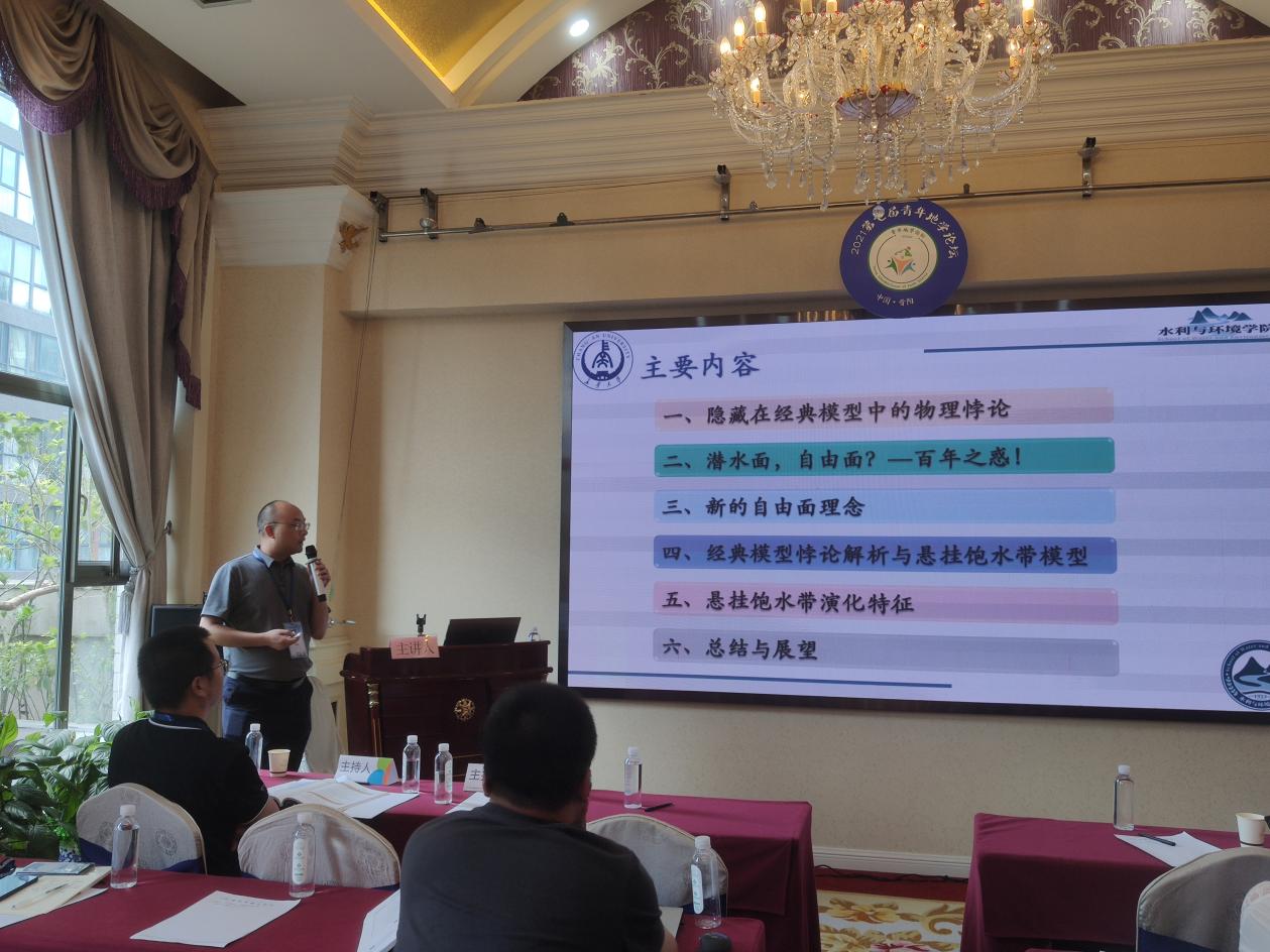 程大伟副教授在地表水-地下水交互作用及模拟专题论坛上作了题为《无堵塞河流悬挂饱水带演化特征》的报告,宣讲了研究团队最新发现,并与参会专家开展了热烈讨论。他指出,具有110年应用历史的经典有压入渗模型(Green-Ampt模型)存在物理悖论,地下水流动的自由边界方程—潜水面方程失效,提出了以进气值平面为自由面的新理念和建立在新自由面理念基础上的悬挂饱水带模型。我院硕士生李凌茜、张其啸、李文璩、冯申、国金琦分别在相关专题论坛上作了题为《Ecological safety assessment of Changtan Reservoir based on DPSIR model》《Groundwater contamination risk assessment using a modified DRASTIC model and pollution loading: a case study in Guanzhong Basin, China》《Groundwater pollution source identification and apportionment using PMF and PCA-APCS-MLR receptor models in Tongchuan City,China》《循环井驱动下具有低渗透性透镜体的二级污染场地修复演化过程》《考虑液固二相互态特性的流固耦合模型》的学术报告。