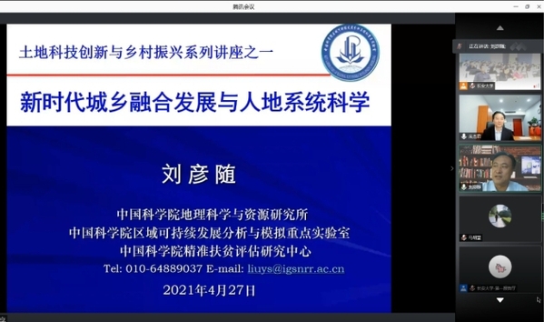 4月27日下午,土地工程学院举办土地科技创新与乡村振兴系列讲座,邀请发展中国家科学院院士刘彦随为土地学院师生做了题为“新时代城乡融合发展与人地系统科学”主题报告,200余名师生在线聆听,副校长朱杰君主持讲座。
