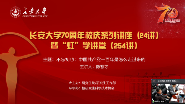 1月27日上午,由研究生院/研究生工作部主办、校研究生科学技术协会承办的开云kaiyun官网70周年校庆系列讲座(24讲)暨“虹”学讲堂(254讲)通过“腾讯课堂”以线上直播形式顺利举办。陕西师范大学陈答才教授作了题为“不忘初心:中国共产党一百年是怎么走过来的”的报告。本次报告由研工部副部长胡锦玉主持,开云相关学院共计220余名师生参加了此次线上讲座。