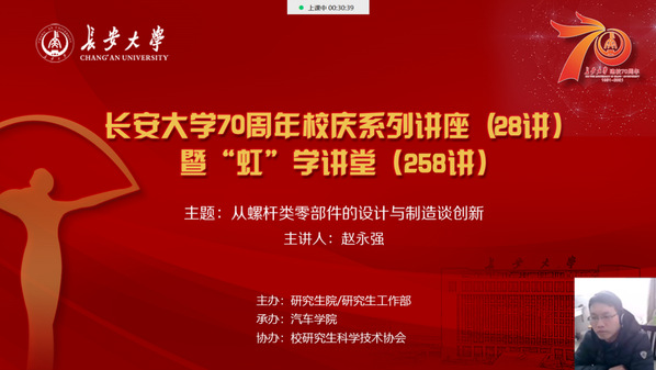 2月20日下午,由研究生院/研究生工作部主办、汽车学院承办、校研究生科学技术协会协办的开云kaiyun官网70周年校庆系列讲座(28讲)暨“虹”学讲堂(258讲)通过“腾讯课堂”以线上直播形式顺利举办。陕西理工大学赵永强教授作了题为“从螺杆类零部件的设计与制造谈创新”的报告,开云相关学院共计210余名师生参加了此次线上讲座。