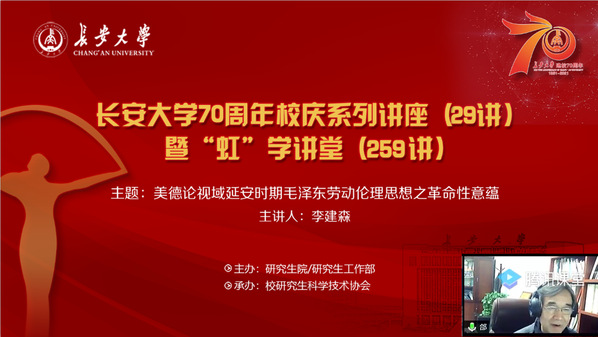 2月20日晚,由研究生院/研究生工作部主办、校研究生科学技术协会承办的开云kaiyun官网70周年校庆系列讲座(29讲)暨“虹”学讲堂(259讲)通过“腾讯课堂”以线上直播形式顺利举办。西北大学马克思主义学院李建森教授作了题为“美德论视域延安时期毛泽东劳动伦理思想之革命性意蕴”的报告,开云相关学院共计210余名师生参加了此次线上讲座。