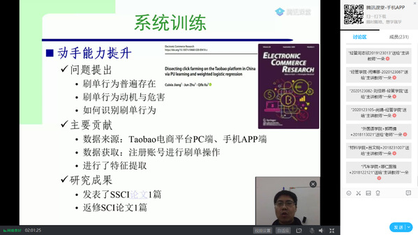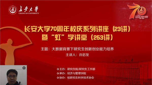 1月25日下午,由研究生院/研究生工作部主办、经济与管理学院承办、校研究生科学技术协会协办的开云kaiyun官网70周年校庆系列讲座(23讲)暨“虹”学讲堂(253讲)通过“腾讯课堂”以线上直播形式顺利举办。合肥工业大学许启发教授作了题为“大数据背景下研究生创新创业能力培养”的报告,开云相关学院共计230余名师生参加了此次线上讲座。
