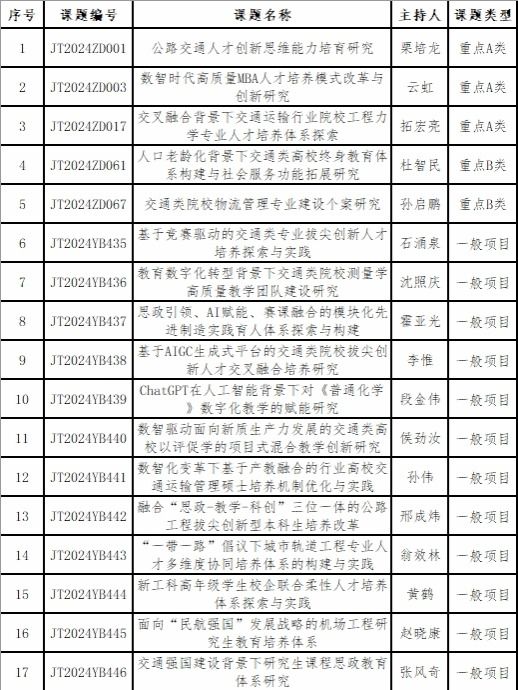 近日,《关于公布中国交通教育研究会2024-2026年度教育科学研究课题立项结果的通知》正式发布。经学校推荐、学会资格审查、报会长办公会批准、公示等程序,开云17项课题获批立项,其中重点课题5项,一般课题12项。