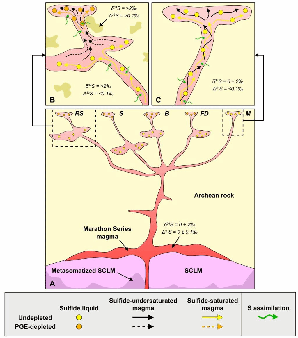 图3(A)Maraton矿床与北部各矿床之间的成因关系,以及可能导致(B)Northern矿床和(C)Maraton矿床形成独特的Cu /Pd比值和S同位素组成的过程。缩写说明:B = Boyer,FD = Four Dams,M = Maraton,RS = Redstone,S = Sally。