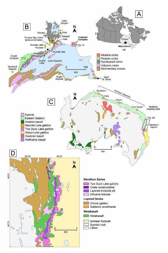 图1 Coldwell杂岩体及北部矿床群和东部Marathon矿床地质简图