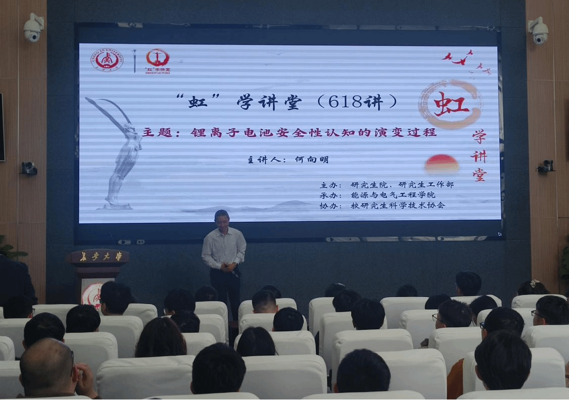 3月26日上午,由研究生院、研究生工作部主办,能源与电气工程学院承办,校研究生科学技术协会协办的“虹”学讲堂第618讲在北校区师生服务大厅第二报告厅举办。清华大学何向明教授作题为“锂离子电池安全性认知的演变过程”的报告,相关学院共150余名师生参加讲座。