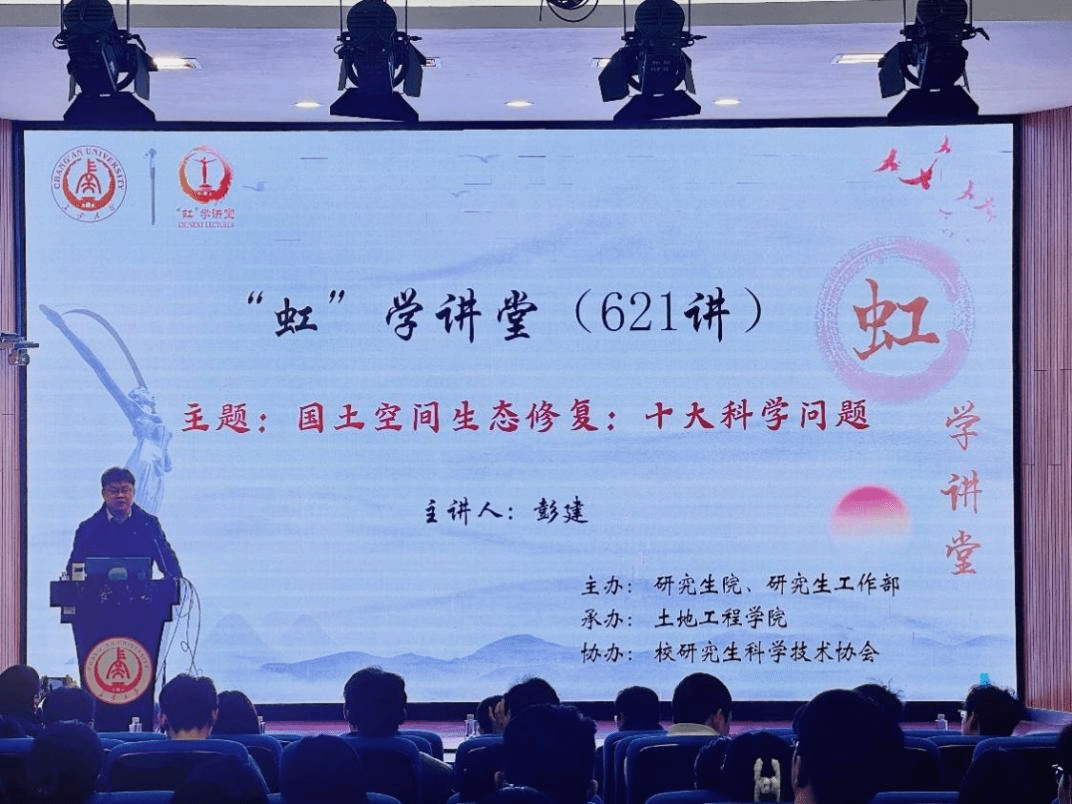 3月30日下午,由研究生院、研究生工作部主办,土地工程学院承办,校研究生科学技术协会协办的“虹”学讲堂第621讲在南校区东院伯声报告厅举办。北京大学彭建教授作题为“国土空间生态修复:十大科学问题”的报告,土地工程学院副院长王晓峰教授主持,相关学院共190余名师生参加讲座。