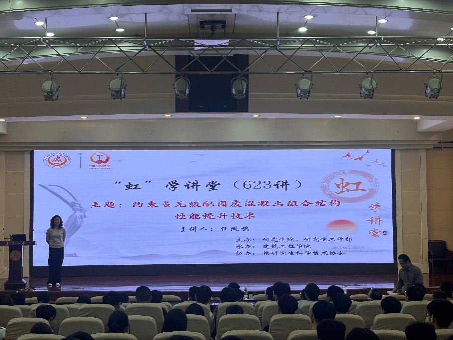 4月7日下午,由研究生院、研究生工作部主办,建筑工程学院承办,校研究生科学技术协会协办的“虹”学讲堂第623讲在南校区北院学术交流中心举办。广州大学任凤鸣教授作题为“约束多元级配固废混凝土组合结构性能提升技术”的报告,建筑工程学院邢国华教授主持,相关学院共180余名师生参加讲座。