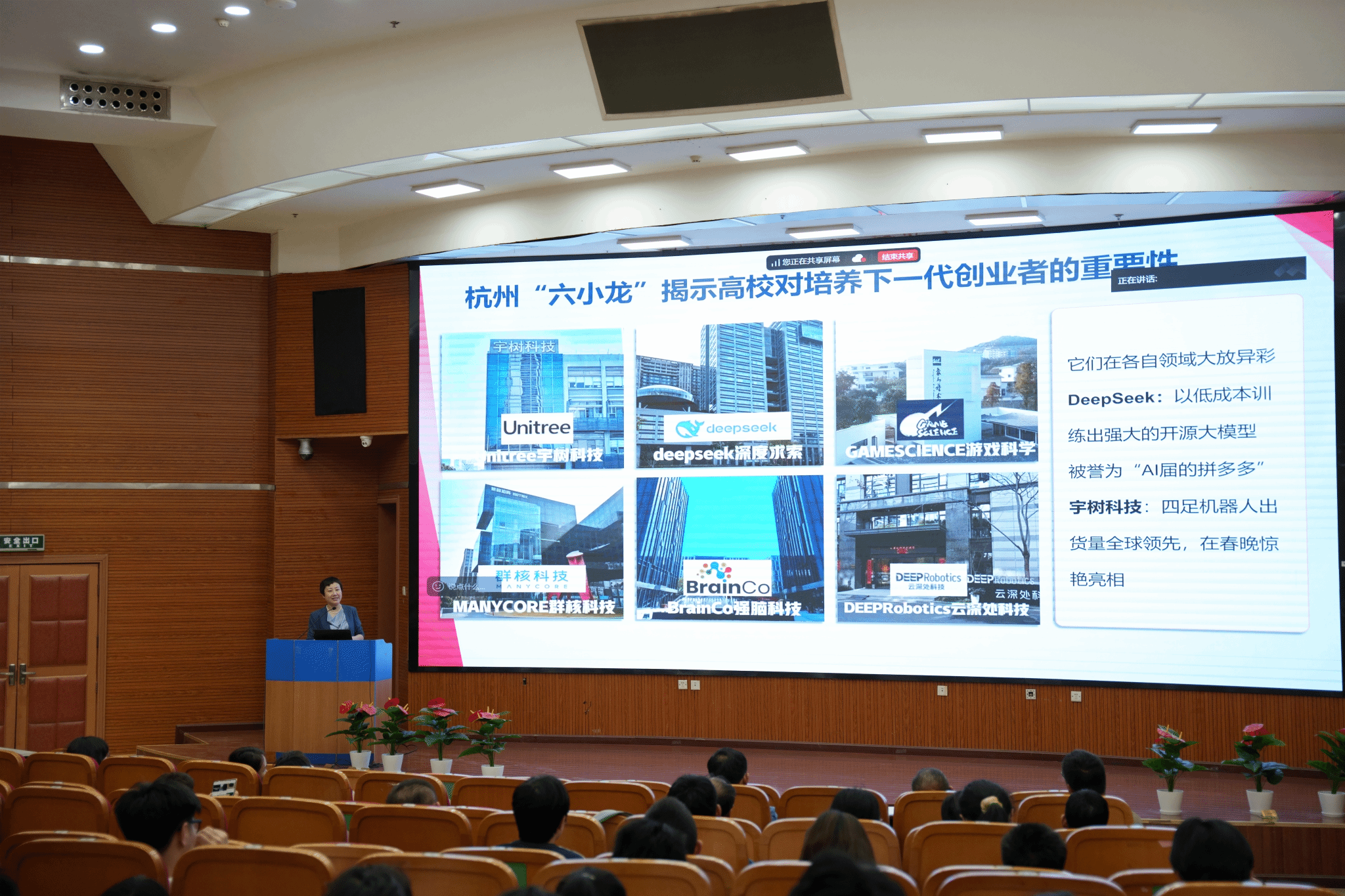 曾莉以“创赛的成长之路”为主题,从当前国家因地制宜培育新质生产力,新产业新业态新模式竞相涌现的大背景大趋势引入,指出要以高校科技之“新”孕育产业之新,“十五五”期间科技创新将成为推动国民经济的核心引擎,引导青年学子在服务国家战略中贡献青春力量。曾莉围绕大赛核心内容,逐一拆解主赛道各组别要求,对比新旧赛制差异,着重讲解了新赛制下对项目技术创新性、商业可行性、社会价值度的多元评估标准。她以多年评审经验为基础,强调了审阅过程中教育维度的重要性,从项目计划书的各项要点,到路演现场团队成员之间的配合,每一个环节都需认真打磨。为了加深同学们的理解,她列举了多个正反案例,深入剖析优秀项目如何讲好“创新故事”,规避常见误区。在报告最后的互动环节,曾莉现场点评了一组团队的项目材料,以专业的视角给予建议,为团队理清项目发展思路指明了方向。她最后寄语同学们,怀爱国之心、立报国之志、增强国之能,把个人奋斗同国家前途命运紧紧联系在一起,跑好历史的接力棒,在推进中国式现代化的宽广舞台上绽放绚丽的青春光彩。