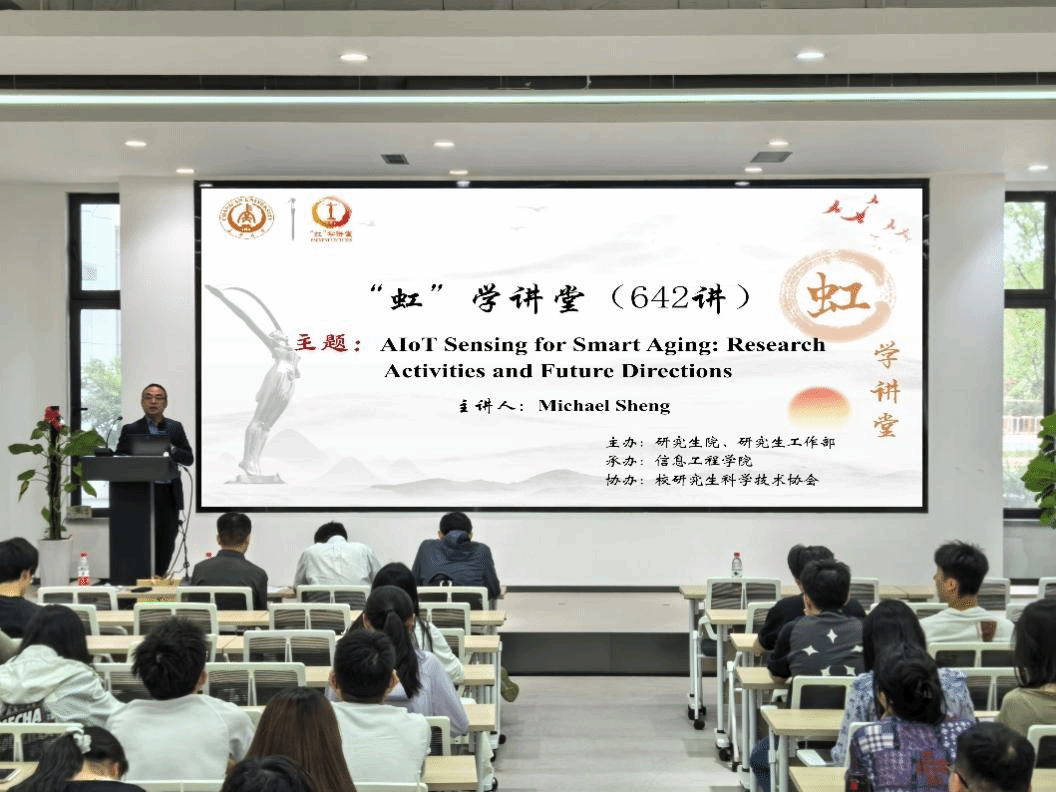 5月23日下午,由研究生院、研究生工作部主办,信息工程学院承办,校研究生科学技术协会协办的“虹”学讲堂第642讲在北校区明德园创新大厦101报告厅举办。澳大利亚悉尼麦考瑞大学Michael Sheng教授作题为“AIoT Sensing for Smart Aging: Research Activities and Future Directions”的报告,信息工程学院单博炜副教授主持报告会,相关学院共130余名师生参加讲座。