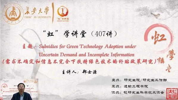 11月28日下午,由研究生院/研究生工作部主办、运输工程学院承办、校研究生科学技术协会协办的“虹”学讲堂第407讲以线上讲座形式顺利举办。上海海事大学院郑士源教授作了题为“Subsidies for Green Technology Adoption under Uncertain Demand and IncompleteInformation(需求不确定和信息不完全下扶持绿色技术的补贴政策研究)”的报告,相关学院共300余名师生参加讲座。