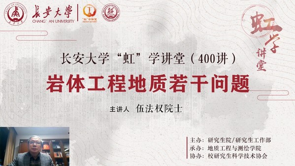 第二阶段为“虹”学讲堂400讲讲座,俄罗斯自然科学院院士、绍兴文理学院教授伍法权作了题为“岩体工程地质若干问题”的报告,地质工程与测绘学院石玉玲老师主持。伍法权教授主要围绕岩体工程地质基础理论、岩体工程的技术问题以及岩体工程中的热点问题三个部分展开。伍法权教授指出,岩体力学理论应用、技术发展和关键地质问题的解决是国家大规模基础设施建设的基本条件,岩体力学理论要从定性、半定量转向建立严密理论体系,岩体工程要进行便捷化、数字化、智能化底层技术改造和提升。