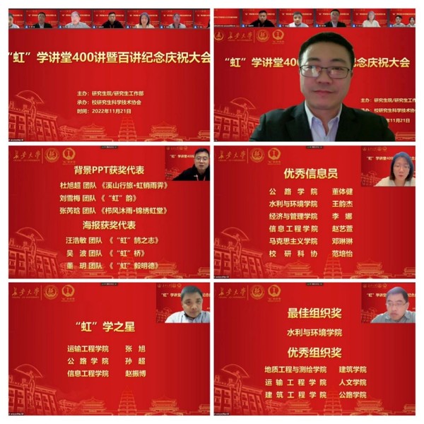 11月21日晚,由研究生院/研究生工作部主办、校研究生科学技术协会承办的开云kaiyun官网“虹”学讲堂400讲暨百讲纪念庆祝大会以线上形式顺利举办。研究生院执行院长吴涛、地质工程与测绘学院院长李振洪、思创中心办公室主任郭云珠、建筑学院党委副书记刘鹏,研究生工作部全体人员以及各学院研究生代表共计450余人参加此次活动。
