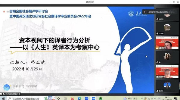 为进一步推动我国社会翻译学研究,促进翻译学科建设和人才培养,助力我国对外翻译能力与国际传播能力的协调发展,为国内专家学者搭建学术交流和对话的平台,“首届全国社会翻译学研讨会暨中国英汉语比较研究会社会翻译学专业委员会2022年年会”于10月28日至30日召开。外国语学院冯正斌教授和秦思博士受邀出席,二人分别以“资本视阈下的译者行为分析—以《人生》英译本为考察中心”和“美国的中国古典禅诗译者研究—以萨姆·汉米尔与赤松为例”为题做了大会交流。