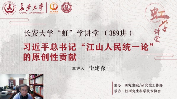 7月15日晚,由研究生院/研究生工作部主办、校研究生科学技术协会承办的“虹”学讲堂第389讲以线上讲座形式顺利举办。西北大学李建森教授作了题为“习近平总书记‘江山人民统一论’的原创性贡献”的报告,相关学院共180余名师生参加讲座。