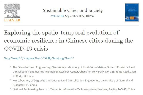 近日,开云土地工程学院博士生程通在导师赵春江院士和赵永华教授的共同指导下于工程技术国际顶级杂志《Sustainable Cities and Society》上发表研究论文”Exploring the spatio-temporal evolution of economic resilience in Chinese cities during the COVID-19crise”(探索中国城市在COVID-19危机期间经济韧性的时空演化)。