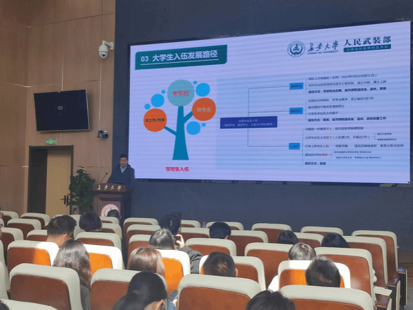 刘光前主要从大学生参军入伍意义、入伍途径、入伍发展路径、入伍报名流程、参军入伍优惠政策、军人福利待遇六方面进行了全面梳理和政策宣讲,重点介绍了大学生参军入伍在升学、就业、资助补偿等方面的优待政策,以及2023年征兵工作流程及注意事项等。