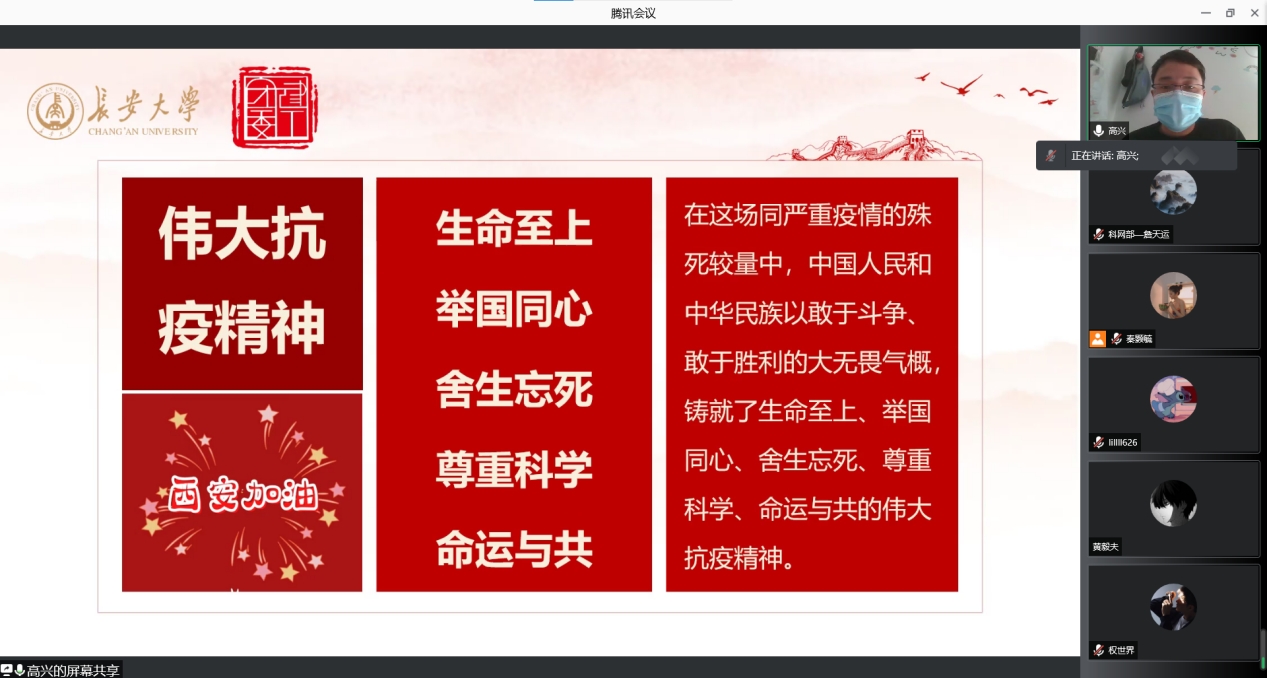 高兴带领同学们重温习近平总书记在全国抗击新冠肺炎疫情表彰大会上发表的重要讲话。他号召同学们从生命至上、举国同心、舍生忘死、尊重科学、命运与共的伟大抗疫精神中汲取战胜疫情的强大精神力量。