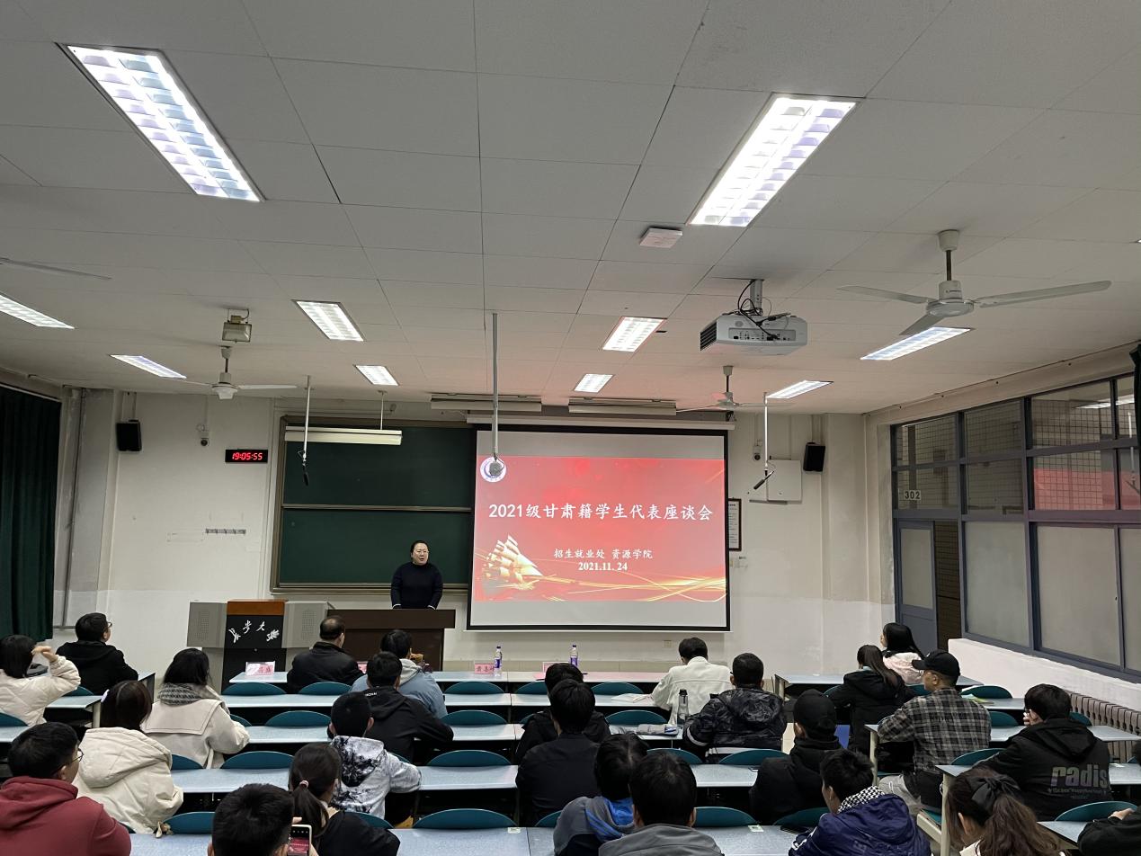 11月24日,由招生就业处主办、资源学院承办的2021级甘肃籍学生代表座谈会在明远教学楼召开。资源学院党委书记黄喜峰、党委副书记武永江,招办副主任王雅蓉,招生办公室、资源学院相关工作人员和2021级甘肃籍学生代表参加座谈会。