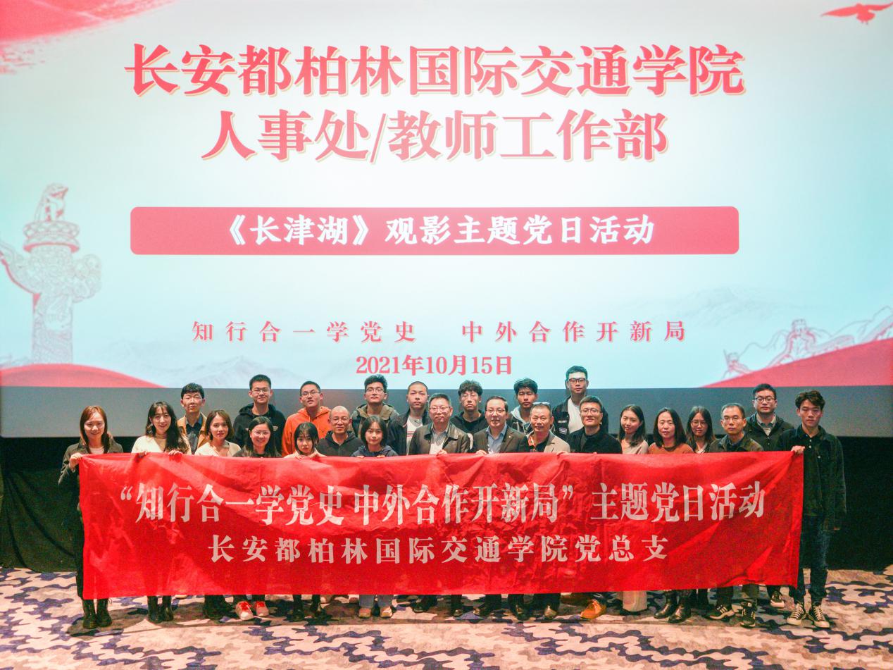 为持续深入开展党史学习教育,进一步弘扬爱国主义精神,10月15日下午,长安都柏林国际交通学院与党建共建部门人事处/教师工作部联合开展“重温峥嵘岁月 强化使命担当”主题党日活动,共同观看红色电影《长津湖》。各部门教职工以及学院部分学生入党积极分子40余人参加活动。