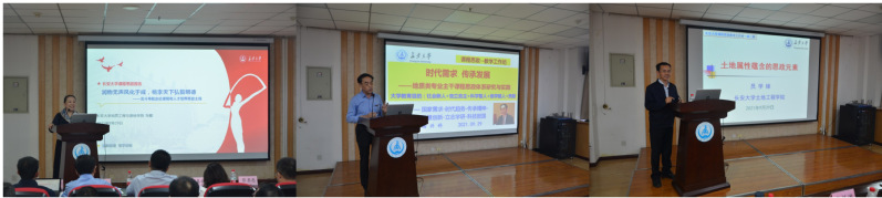 主题报告环节,地测学院张勤教授以“润物无声风化于成,桃李天下弘毅明德”为题作报告,她指出教师应具备“师德、师品、师能”,以及“责任心、自信心、爱心”,力争做到“课程有温度、教学有巧度、教师有态度”,才能达到育人润物细无声的效果。资源学院杨兴科教授以“时代需求,传承发展”为题作报告,他介绍了地学专业课程思政特色及课程思政元素,并从案例中提炼出“兴趣主动式、榜样式、钻研式、报国式、思维辩证式”五维思政范例。土地学院员学锋教授以“土地属性蕴含的思政元素”为题作报告,他结合土地的经济、社会等属性和教学案例,详细阐述了其中蕴含的课程思政元素。