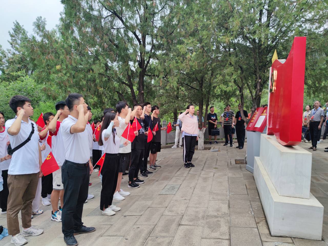 7月13日,实践队来到了宝鸡烈士陵园。在陵园中有两百多位烈士在此安息。实践队员们瞻仰了纪念碑,对陵园中安葬的烈士进行了祭奠吊唁。在祭奠过程中,实践队员们被张向博烈士的事迹深深震撼,年仅22岁的他为了保护战友,献出了自己年轻的生命,用最出色的消防生涯,书写了生命中最华丽的篇章。实践队员们在张向博烈士的墓前伫立默哀,寄托哀思。“少年强则国强、少年进步则国进步”。在烈士陵园中,实践队员们还偶遇了小朋友致敬先烈。一位小朋友带着满脸的骄傲和自豪在在纪念碑前庄重的敬了一个礼,而她的家长则是微笑着为她拍照留念。虽然只是一个简简单单的敬礼,但是实践队员们却感受到了小朋友对革命烈士深深的敬意。
