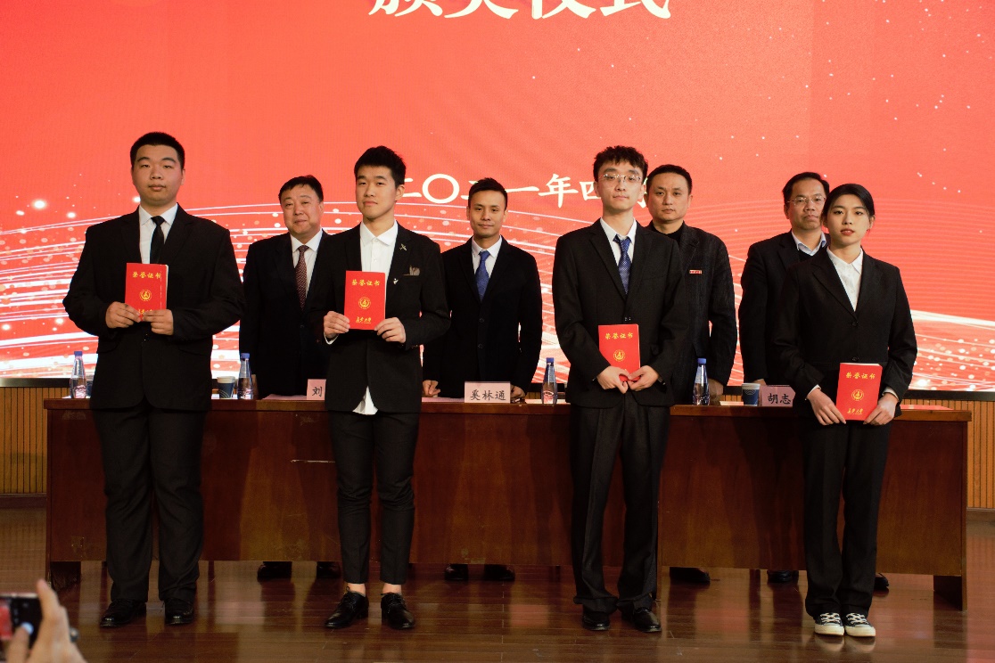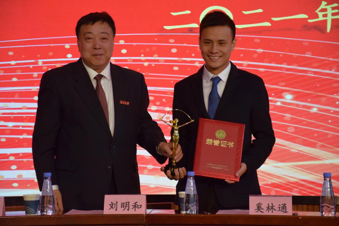 欧阳韬宣读2021年“第一届开云kaiyun官网路蓝奖学金”获奖学生名单。与会领导嘉宾为获奖学生颁发荣誉证书。刘明和为奚林通颁发捐赠证书。