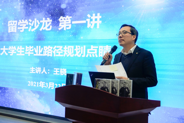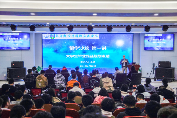 为了系统提升同学们出国交流能力,启发大家对学习生涯提前做出思考,拓宽看待未来的眼界格局,3月22日,长安都柏林国际交通学院在鸿远教学楼四楼报告厅举办“留学沙龙”系列讲座第一讲,特邀新东方前途出国项目团队与同学们进行交流咨询,陕西分公司英国部金牌规划师王骁作主题为“大学生毕业路径规划点睛”的报告。新东方前途出国助理副总裁、陕西分公司总经理卢一航,学院副院长柏强出席了此次活动。活动由学院党总支副书记、副院长姚以亮主持。