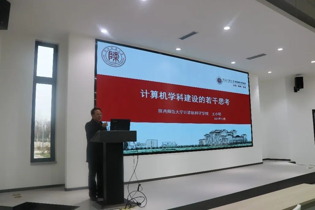 王小明教授从学科结构建设、学科方向建设、学科建设的原则、学科建设的心得体会、研究生指导经验分享五个部分展开报告,介绍了学校层、学院层、团队层、学者层的职责。从学科方向建设出发,详细介绍了陕西师大计算机科学技术一级学科方向;王小明教授指出,我们追求的目标是不求一方独秀,但求四方协调;要努力使学科与国际接轨,实现国际化的发展;同时,注重学科的贡献和影响力,以实际行动为学科发展做出贡献;立足于学科的内涵方向,深入研究学科的核心内容和基础理论;以方向为引领,组建优秀团队,依托团队的力量,形成梯队式的发展格局。王小明教授分享了学科建设以来的心得体会和研究生指导方面的经验,他详细介绍了学院在评价规则和导师资助规则中的改进措施,就如何平衡学生精神情感和学业正常发展是研究生指导工作中的难题,他指出,这是老师的压力和责任,及时关注学生身心健康,多与学生交流;就如何应对学生的实用心态与导师学术追求之间的矛盾问题,他指出要因材施教,以学生为主,为学生创造良好的环境。