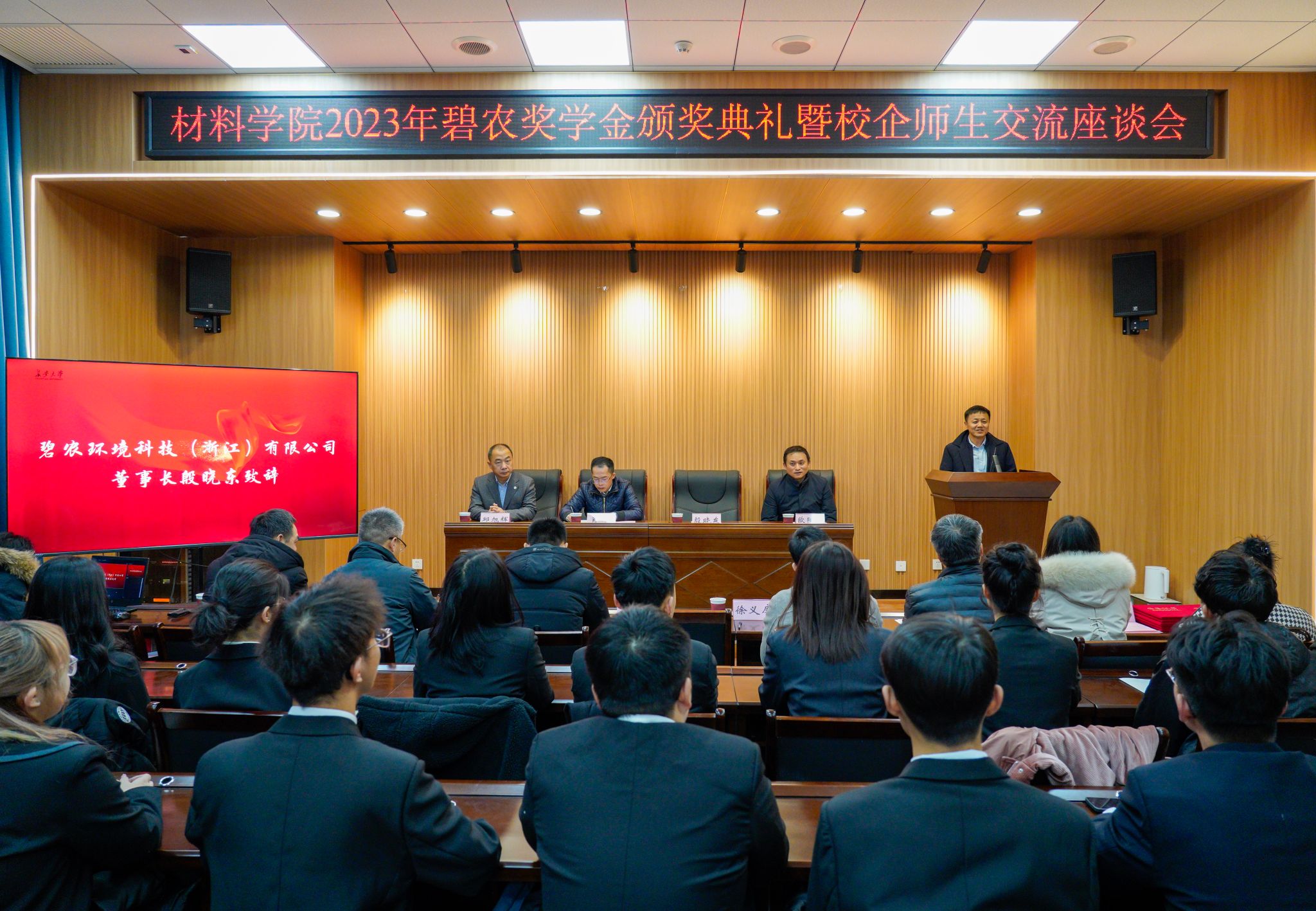 为进一步深化资助育人成效,激励广大受助学生奋发自强、立志成才、感恩奉献,12月21日上午,材料科学与工程学院于北校区致远大厦三层报告厅举行2023年碧农社会奖学金颁奖典礼暨校企师生交流座谈会。捐资助学企业碧农环境科技(浙江)有限公司董事长殷晓东、行政总监唐天勇,开云社会合作处副处长邱旭辉、资助中心主任欧阳韬、学院院长肖月、副院长徐义库、对外合作交流中心主任齐琳、成型及控制工程系周亮、学生工作办公室主任杨树等教师代表、各年级学生代表参加典礼。典礼由学院党委副书记张晓琳主持。